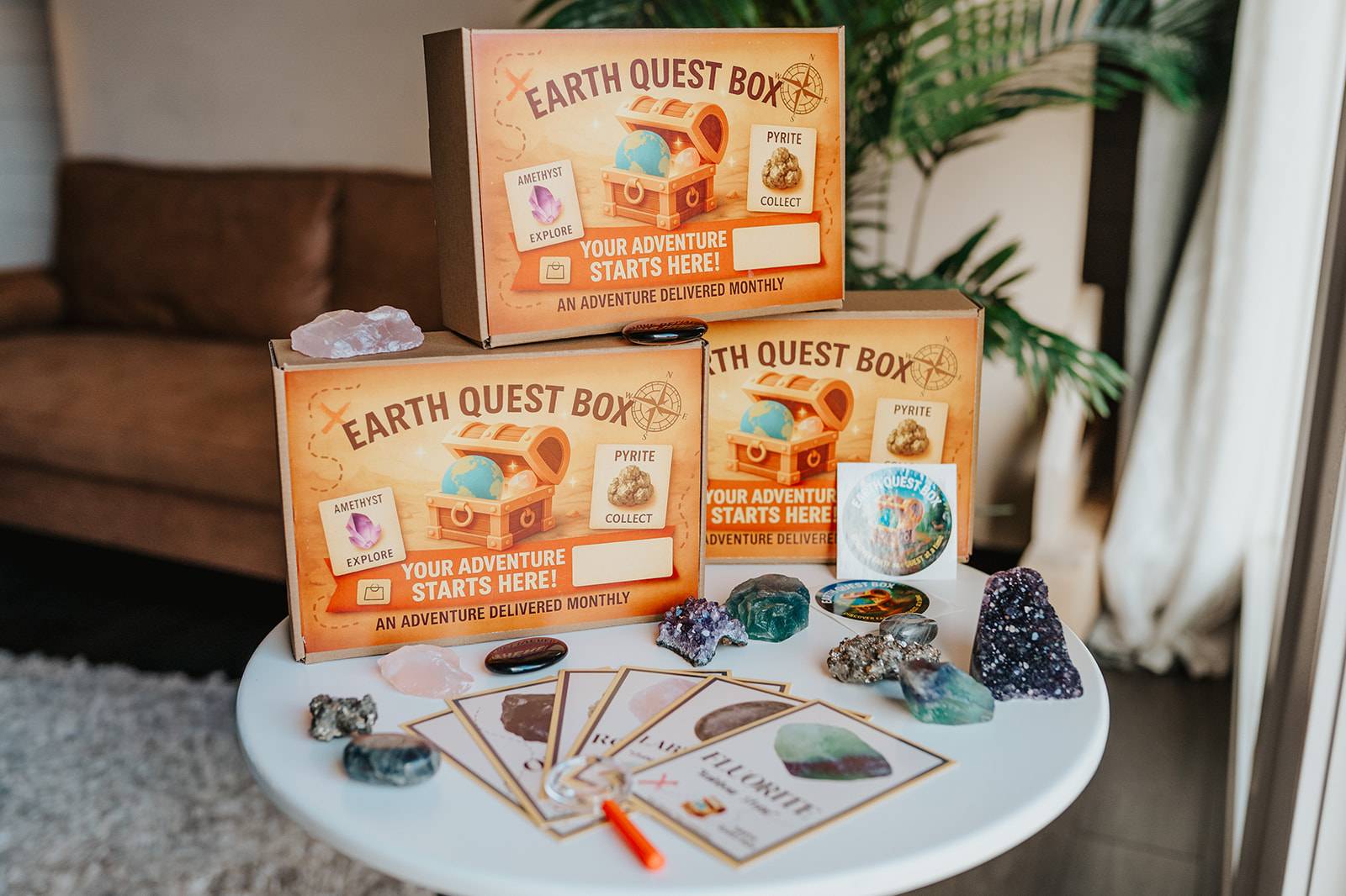 Every Earth Quest Box includes real mineral specimens, hand-picked, beautifully unique, never plastic.